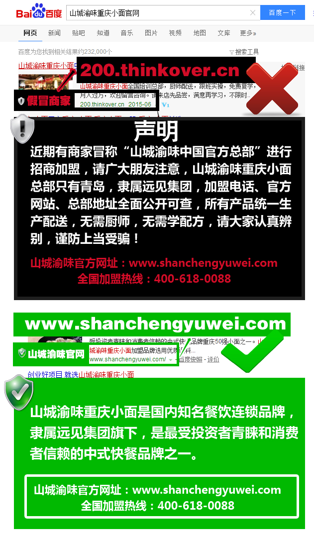 目前有多家假冒山城渝味重慶小面的網站在進行招商加盟,圖片暫舉一例,望廣大朋友加盟之前一定要認清!有問題請致電4006180088